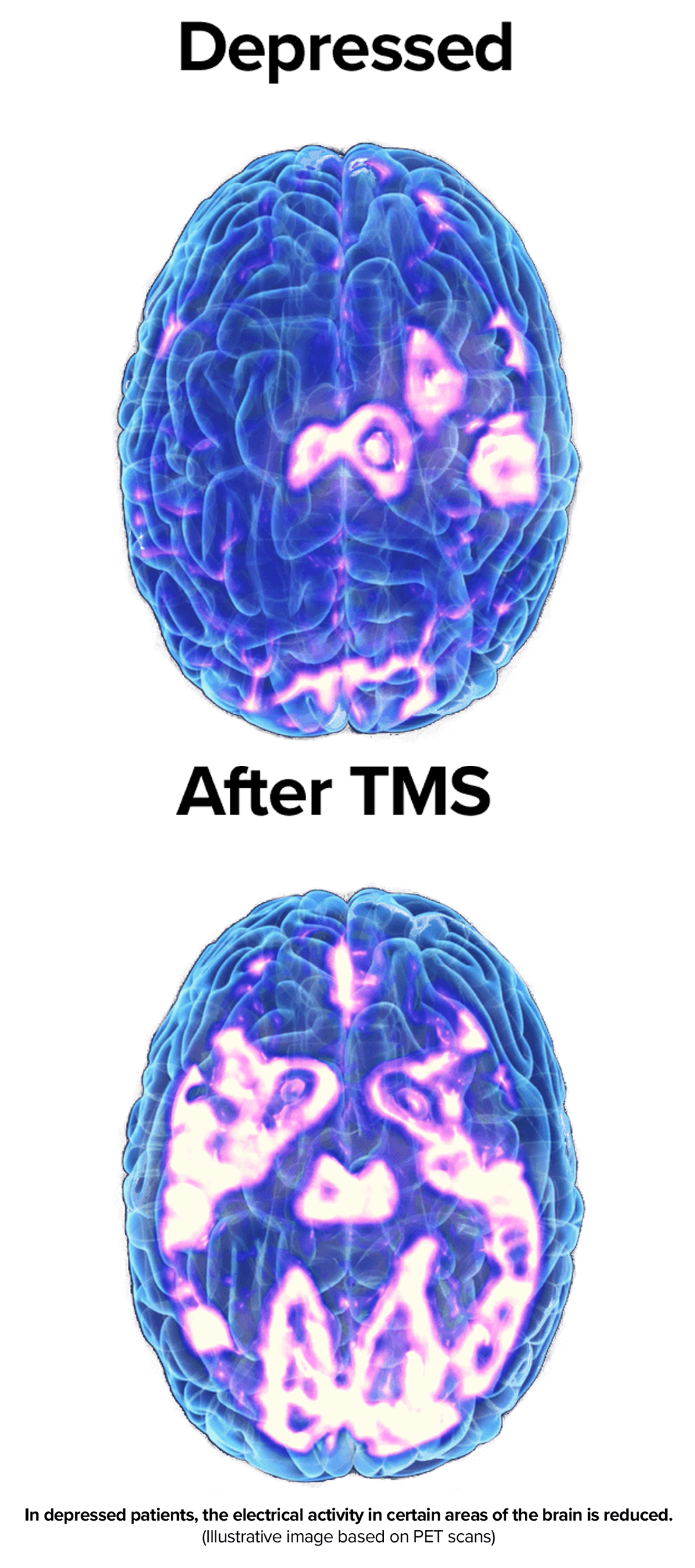 Researchers have suggested that for some people, having too little of certain substances in the brain (called neurotransmitters) could contribute to depression. Restoring the balance of brain chemicals could help alleviate symptoms, Transcranial Magnetic Stimulation (TMS) is non-invasive and nonsystemic (non-drug) method to help restore this balance.